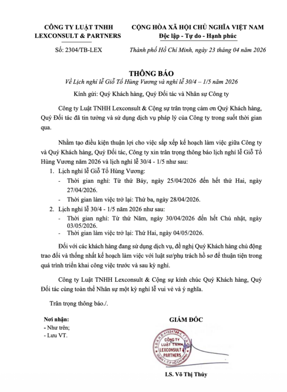 Đối với Quý Khách hàng đang sử dụng dịch vụ của Lexconsult & Partners, vui lòng chủ động trao đổi và thống nhất kế hoạch làm việc với Luật sư/Chuyên viên phụ trách hồ sơ để việc triển khai công việc trước và sau kỳ nghỉ được thuận tiện, không gián đoạn.
